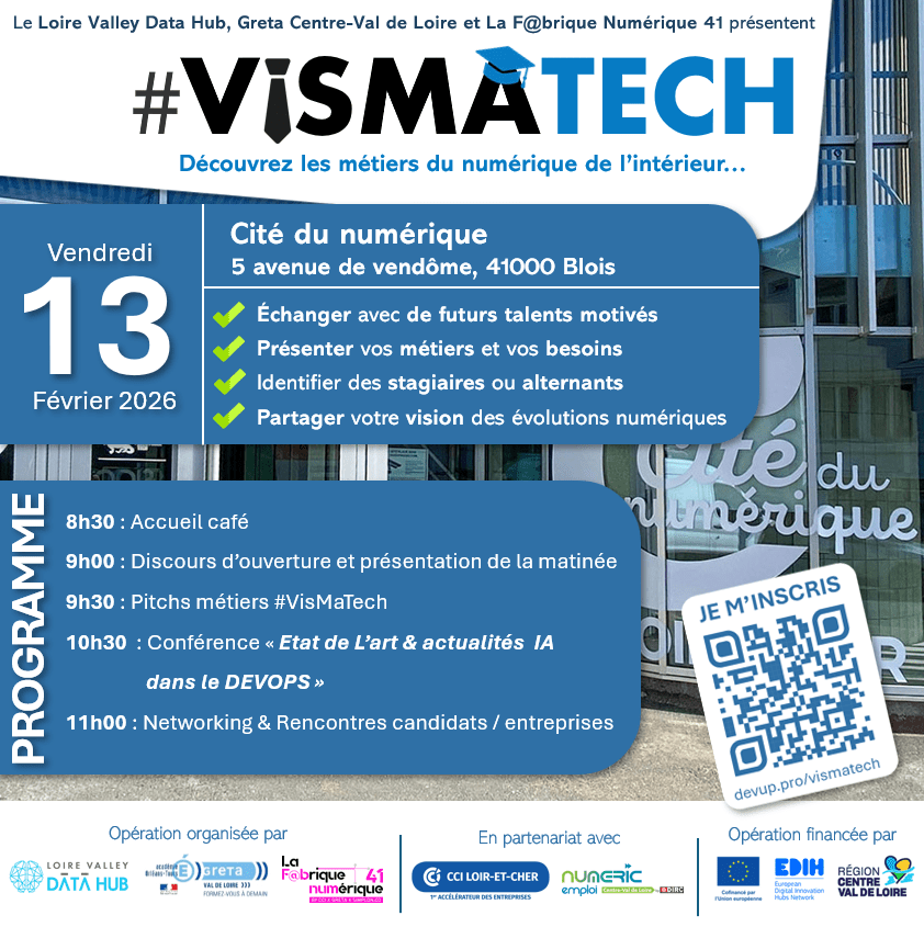 Le secteur numérique du Centre-Val de Loire se mobilise pour rapprocher professionnels et futurs talents. L’événement #VisMaTech 2026, organisé par DEV’UP Centre-Val de Loire, La F@briqueNumérique41, le Greta Centre-Val de Loire et les CAMPUS CCI dans le cadre du Loire Valley Data Hub, ouvre ses portes aux entreprises du territoire.